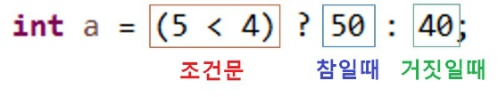 삼항연산자의 예를 가볍게 들어보겠습니다. 위와같은경우 괄호안의 조건문이 참일경우 int a에 50이 담기게 되고 거짓일경우에는 40이 담기게 되는 코드입니다. 삼항연산자는 (조건문) : ? 참 : 거짓 이라는 문법을 가지게 됩니다.