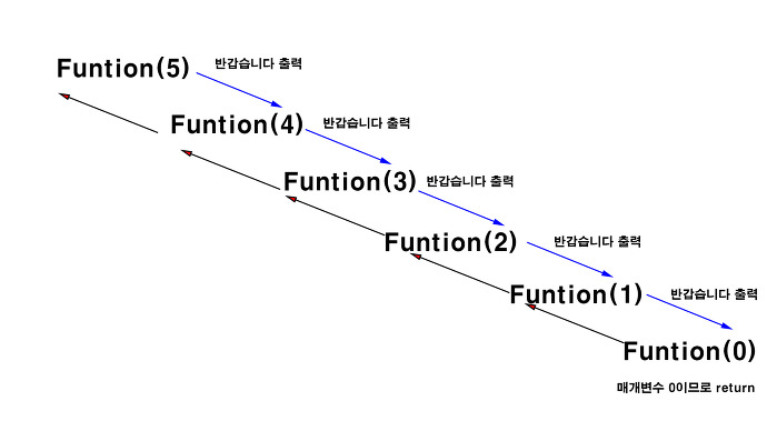 ▼ 함수를 살짝 수정해보겠습니다. Function Method는 매개변수 num을 받고 if 구문에 의해 분기가 되고 있습니다. 매개변수 값이 0일 경우 return을 하고 0이 아닐 경우 "반갑습니다"를 출력하고 num - 1에 해당하는 값을 매개변수로 전달하고 있습니다. 여기서 num 값이 0일 경우 return을 하게 되는 구문이 이 재귀 함수의 Base Case 구간이 됩니다. 해당 재귀 함수의 호출을 그림으로 보면 아래와 같습니다.