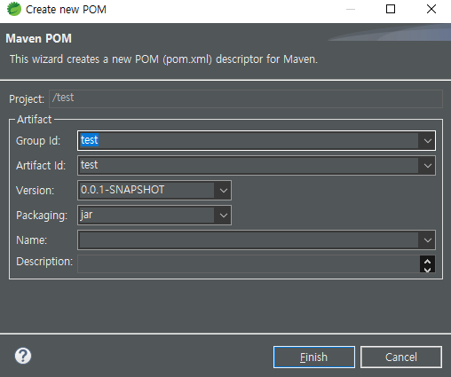 - Create new POM 팝업 >> Finish 클릭