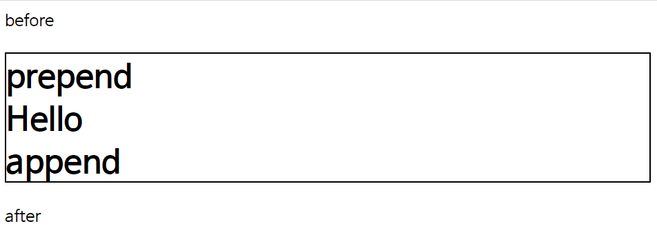 before와 after와는 다르게 prepend와 append는 h1요소 내에 포함된 것을 확인할 수 있다.