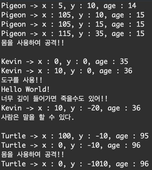 Kevin클래스에서도 오버라이딩하여 재정의 해줄 수 있다. 케빈 같은 경우는 y값이 -10이하로 내려가면 죽을 수도 있다는 것을 알려주는 또 다른 기능으로 재정의 했습니다. 바로 이런 부분에서는 추상클래스 말고 인터페이스를 사용하는 것이 좋겠죠??