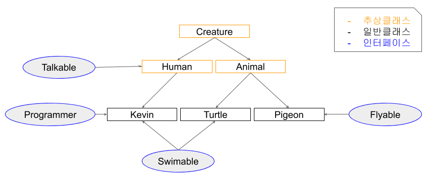 위와 같은 관계를 갖는 예제를 만들어 보겠습니다. 인간과 동물은 생명체를 상속하고 각 생명체들은 구분에 따라 인간과 동물을 상속합니다. 그리고 각각 할 수 있는 기능들을 인터페이스로 구현했습니다.